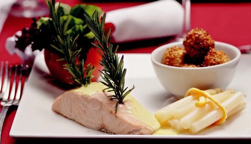 Tencerenin içine 1 adet boş tabağı ters koyun. Tabağı geçmeyecek şekilde su ekleyin. Somonları tabağın üzerine yerleştirin. Tencerenin kapağını kapatın ve 8 dakika buharda pişirin. Sos için, krema ile hardalı karıştırarak 1 dakika pişirin ve sosluğa dökün. Patates kroketleri, önce çırpılmış yumurtaya, sonra da susama bulayarak kızgın sıvı yağda kızartın.