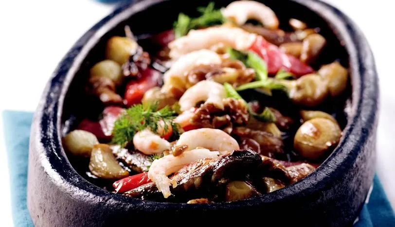 Öncelikle balığı temizleyin ve kılçığını çıkarın. Bol suyla yıkayıp, süzülmesi için bir kenara alın. Tavaya aldığınız tereyağında dolmalık fıstık,ceviz içi ve Meksika biberini hafifçe soteleyin. Karides ve mantarı ilave edip, 1-2 dakika daha sotelemeye devam edin. Kabukları soyulmuş ve küp doğranmış domates, kıyılmış maydanoz, soya sosu, kekik, biberiye ve karabiber ekleyip, tüm malzemeyi şöyle bir çevirdikten sonra tavayı ocaktan alın. Balığı güveç kabına yerleştirin. Üzerine sotelenmiş fıstıklı karışımı yayın ve şarap veya suyu gezdirin. Önceden ısıtılmış 200 derece fırında 15 dakika pişirin. Sıcak olarak servis yapın.