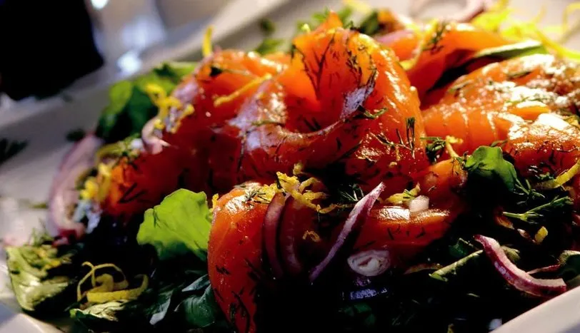 Önce servis yapacağınız tabağın tabanını roka ile yükseltin. Somonları dilerseniz rulo sararak ya da gül şeklinde kıvırarak rokaların üzerine yerleştirin. İnce doğradığınız halka soğanları, somonların üzerine dizin. Eğer ince rende bıçağınız varsa, limon kabuklarını şeritler halinde rendeleyin (ama bıçağınız yoksa çok ince halkalar kesip, ikiye bölerek de somonların üzerine koyabilirsiniz). En üste zeytinyağını gezdirin. İnce kıyılmış dereotu ile süsleyerek servis yapın.