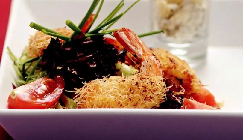 Zeytinyağı, tuz ve karabiberi karıştırın. Karidesleri zeytinyağına bulayıp, kuyrukları açıkta kalacak biçimde kadayıfa sarın. Kızgın sıvı yağda kızartın.