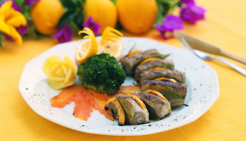 Fileto hazırlanmış orkinos balıklarını 6 adet olacak şekilde ince (slayt) dilimleyerek, içlerine rendelenmiş parmesan peyniri yerleştirin. Üzerine beyaz biber ve tuz serpip, rulo şeklinde sarın. Çöp şişlere 1 adet permasan peynirli rulo balık, 1 dilim limon, 1 adet defne yaprağı olacak şekilde dizin. Kızgın ızgarada her tarafını eşit olarak pişirin. Şişlerden çıkarıp servis tabağına aktarın. Haşlanmış sebze garnitürüyle birlikte servis yapın.