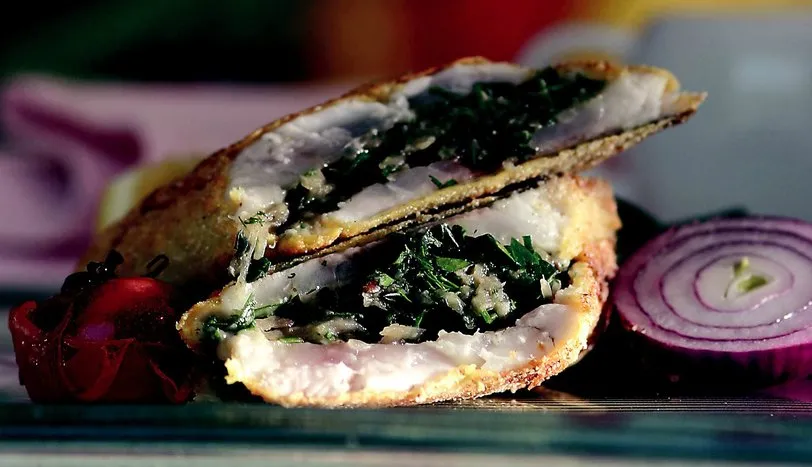 Piyazlık doğranmış soğanı zeytinyağında pembeleşene kadar soteleyin. Kıyılmış maydanoz, dereotu ve naneyi ilave ederek karıştırmaya devam edin. Yenibahar ve karabiberi ekleyin. Ocaktan alarak, soğumaya bırakın. Fileto levreklerin arasına soğanlı karışımdan yerleştirin. Sırasıyla un, yumurta ve mısır ununa bulayın. Ağır ateşte, tereyağında kızartın. Ilık veya sıcak olarak mevsim yeşillikleri ile servis yapın.
