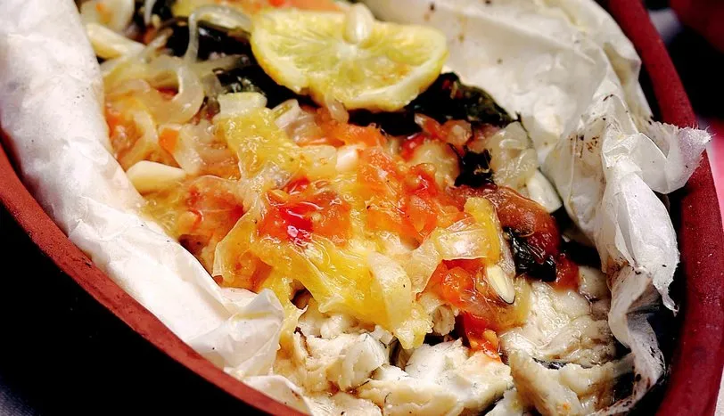 Yağlı kağıda, bir tarafı boş kalacak şekilde iki adet levrek filetosunu koyun. Üzerlerine yarım halka şeklinde dilimlenmiş limon, domates ile birlikte ince kıyılmış soğan ve sarımsağı ilave edin. Maydanoz yaprakları, tuz ve karabiber ekledikten sonra, en üste eritilmiş tereyağı gezdirin. Bir tarafı boş bırakılan yağlı kağıdı düzgünce katlayıp, kıvırın. Izgarada 1 saate yakın pişirip, sıcak olarak servis yapın.