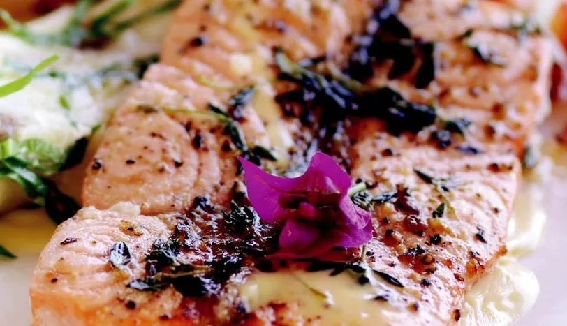Somon filetoyu ızgara yapın. Haşlanmış patatesleri sıcak olarak soyup, rendeleyin. İnce kıyılmış taze fesleğen, toz parmesan peyniri, un, yumurta ve baharatı ilave ederek harmanlayın. Toz şeker ve limon ile ceviz içini, yapışmaz yüzeyli bir tavada, orta ısıdaki ateşte karamelize edin. Streç film üzerine patates ezmesini 2 cm kalınlığında serin. Karamelize cevizleri ortasına yerleştirin. Rulo yaptıktan sonra, lokum şeklinde kesin. Buzdolabında 1-2 saat dinlendirip, tereyağında kızartın. Zeytinyağı, sarımsak, taze fesleğen, tuz, taze karabiber ile ortadan ikiye kesilmiş biberleri marine edin. Izgarada közleyin. Ortasına iki dilim mozarella peyniri koyun. 180 derecede ısıtılmış fırına verin. Minik küpler halinde doğranmış soğan ve sarımsağı soteleyin. Krema, tereyağı ve baharatları ilave edin. Sulandırılmış nişasta ile sosun kıvamını ayarlayın. İnce kıyılmış frenk soğanı ilave edin. Sırası ile tabağa malzemeleri yerleştirin. Izgara somon ile birlikte servis yapın.