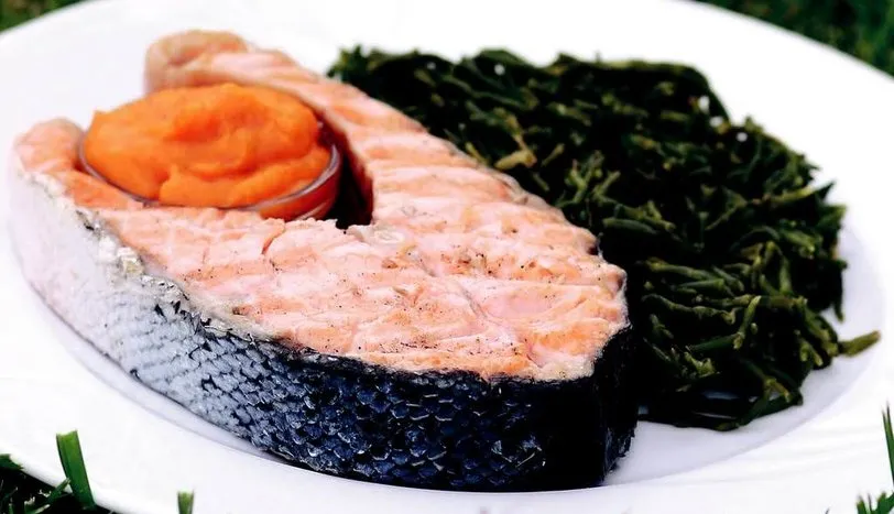 Somonu ızgarada önlü arkalı pişirin ve servis tabağına alın. Sos için ince kıyılmış sarımsak ve salçayı sıvı yağda soteleyin. Haşlanmış ve rendelenmiş patates ile safranı ilave edin. 2-3 dakika daha sotelemeye devam edin. Izgara somonu hazırladığınız sos ve haşlanıp ayıklanmış deniz börülcesi ile birlikte servis yapın.