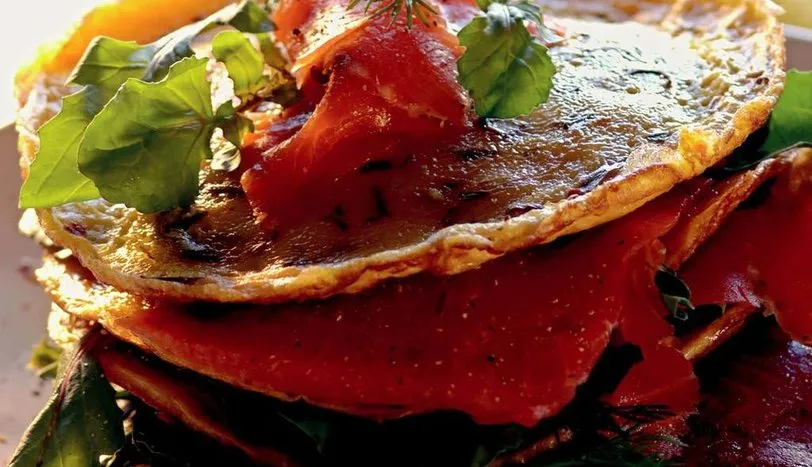 Yumurtaları geniş bir kaba kırıp üzerine süt, tarhun, pul biber ve tuz ekleyip karıştırın. Küçük bir tavayı yağlayın. Yumurtalı karışımdan bir kepçe yardımı ile alarak tavaya döküp pişirin. Bu şekilde 5 adet küçük omlet hazırlayın. Somon pastırması dilimlerini kırmızı ve beyaz biberle tatlandırın. Daha sonra dilimleri ikiye bölün. Bir adet omleti servis tabağına alın üzerine roka, dereotu ve maydanoz yaprakları yerleştirin. Onların üzerine 1 parça somon pastırması koyun. Aynı işlemi omletler bitene kadar tekrarlayın. En üste bir dilim limon koyarak servis yapın.