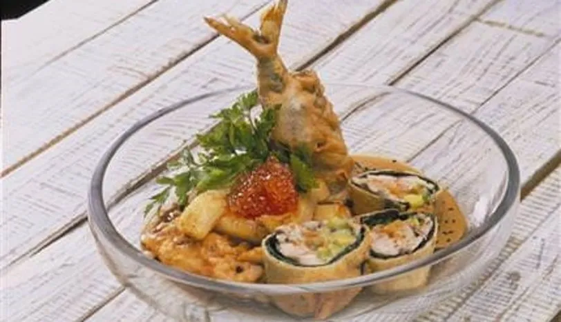 Uskumru balıklarının orta kemiği ve kılçıklarını temizleyip açın. Tuz ve karabiber serpin. Açılan balıkların içine haşlanmış pazıları dizerek silindir halinde sarın. Tempura sos malzemelerini derin bir kapta karıştırın. Balık rulolarını, hazırladığınız tempura sosa batırıp çıkararak kızgın yağda pişirin. Küp doğranmış kuru soğan ve sarımsağı tereyağında pişirin. Risottoları atıp tuz, karabiber ekleyin ve beraber pişirin. Daha sonra krema ve parmesan peynirini tavuk suyuyla beraber kısık ateşte pişirin. Balzamik sirkesi, soya sosu ve mayonezi mikserde çekip sos haline getirin. Bir tabağa, dilimlediğiniz uskumruları, yanında risotto ile alın. Daha sonra doğranmış muzları, tempura sosa atıp kızgın yağda pişirin. Risottoların üzerine dizin. Balzamik sirkesi sosu ve havyar ile servis yapın.