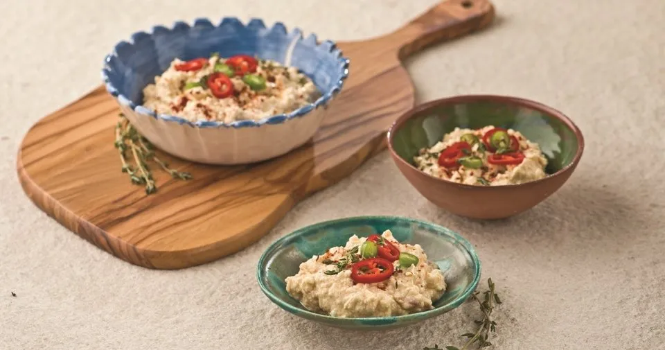 Peyniri blenderin haznesine alın. Yoğurt, zeytinyağı, biberler, pul biber, sarımsak ve sirkeyi ekleyip karışım ezilene kadar makineyi çalıştırın. Servis tabağına alıp üzerine dilimlenmiş biberleri ve pul biberi serpiştirin. Kekikle süsleyip servis yapın.