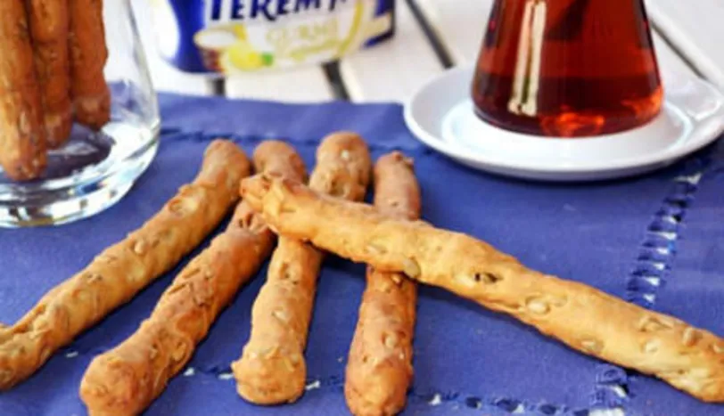 Hamur için gerekli bütün malzemeleri geniş bir kapta yoğurup 1 saat kadar dinlendirin. Hamuru ceviz büyüklüğünde parçalara ayırıp her bir parçadan 20 cm uzunluğunda ince çubuklar açın. Hazırlanan çubukları 165 derece fırında iyice kızarana kadar pişirin. Daha sonra fırının içinde soğumaya bırakın. Tamamen soğuduktan sonra fırını bu sefer 140 dereceye ayarlayıp, 20 dk kadar daha pişirin. Soğuduktan sonra tazeliğini koruması için ağzı kapalı kaplarda saklayın.
