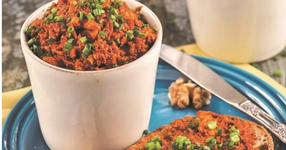 Kurutulmuş biber ve domatesleri ayrı kaplara alıp üzerilerine su ilave edin ve yumuşayana dek bekletin. Sularını süzdükten sonra ince kıyın. Biberleri büyük bir kaseye alın. Üzerine kıyılmış ceviz, sarmısak, limon suyu, salça ve baharatları ekleyip karıştırın. Zeytinyağını yavaşça ilave edip karıştırmaya devam edin. Kıyılmış kuru domates, çiğ badem ve maydanozu katın. Süzme yoğurt, beyaz peynir ve galeta ununu karışıma ilave edip harmanlayın. Frenk soğanını kıyıp yarısını üzerine ekleyin. Ezmeyi kızartılmış ekmek dilimlerine sürüp kalan frenk soğanıyla süsleyerek servis yapın.