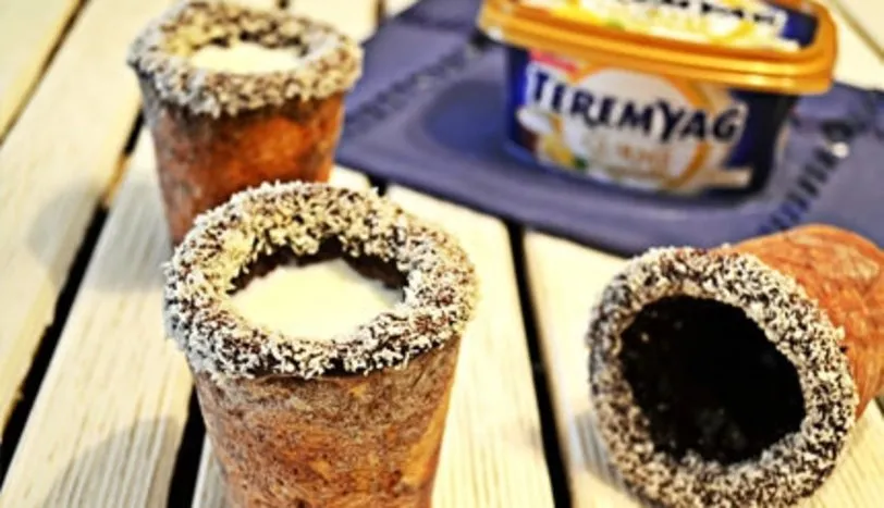 Kurabiye hamuru için kakao hariç bütün malzemeleri bir kapta yoğurup hamuru iki parçaya ayırın. Bir parçasına kakao ekleyip yeniden yoğurun. Bu iki parçayı birleştirip yarım cm kalınlığında açın. Hamurdan çay bardağı ile 6 adet yuvarlak kesip kağıt bardakların dibine yerleştirin. Hamurun kalan kısımlarından kağıt bardakların içini saracak ölçüde dikdörtgen parçalar kesip içine yerleştirin. Ardından içlerine kabarmaması için pişirme kağıtlarından küçük toplar yapıp yerleştirin. 175 derece fırında üst kısımları hafifçe pembeleşinceye kadar pişirin. Pişen kurabiye bardaklarını kağıt bardaklardan çıkartıp soğutun ve içindeki kağıtları çıkartın. Diğer taraftan benmari usulü çikolataları eritin. Soğuyan kurabiyelerin iç kısmına iki kat olacak şekilde fırça ile sürün. Ağız kısmını da önce çikolataya sonra da hindistan cevizine batırarak çikolata tamamen donana kadar bekletin. Daha sonra içine süt, meyve ya da şekerlemeler koyarak servis yapın.