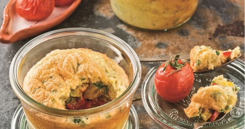 Yumurtayı iyice çırpıp, kalan malzemeyi üzerine ilave edin ve karıştırın. Porsiyonluk, fırına dayanıklı cam kapları fırça yardımı ile yağlayıp, omlet harcını kapların üzerinde iki parmak boşluk kalacak şekilde içlerine pay edin. Önceden ısıtılmış 160 derece fırında 25 dakika pişirin.