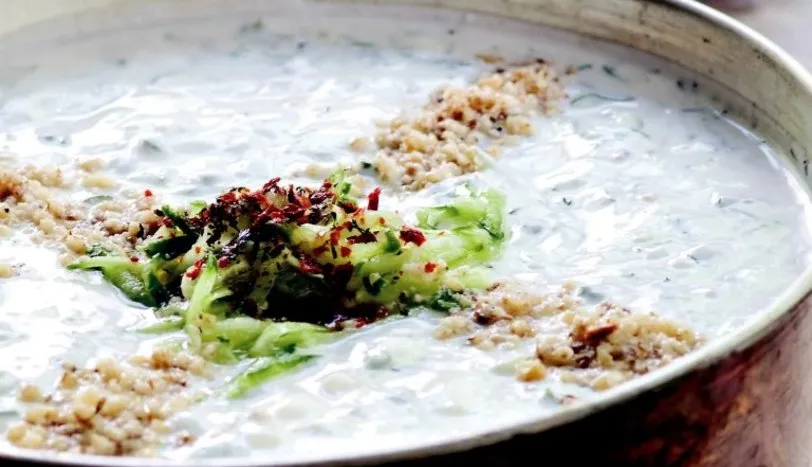 Yoğurdu derin bir kaba alıp içine ceviz ve fındık ekleyin. Rendelenmiş salatalık, kıyılmış reyhan ve tuz ilave ettikten sonra tüm malzemeyi karıştırın. Üzerini fındık, nane ve kıyılmış reyhan ile süsleyip, soğuk olarak servis yapın.