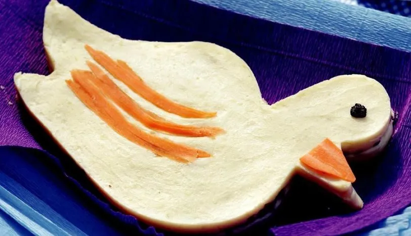 Patatesleri haşlayıp süzüldükten sonra kabuklarını soyun. Derin bir kaseye alın ve tuz ekleyip iyice ezin. Beşamel sos için, bir tavada kızdırdığınız tereyağında unu kavurun. Sütü ilave edin ve 1-2 dakika daha kavurduktan sonra ocaktan alın. Beşamel sosu patatesin içine katın ve karıştırın. Sosisleri haşlayın ve halka şeklinde doğrayın. Patatesin yarısını civciv şeklinde bir kalıba yayın. Üzerine sosis ve kaşar peyniri serpin. Kalan patatesi sosisli karışımın üzerine yayın. Civcivi kalıbından yağlı kağıt serilmiş bir fırın tepsisine çıkarın. Önceden ısıtılmış 175 derece fırında 5-10 dakika pişirin. Servis tabağına aktarın. Havuçtan kanat, zeytin ezmesinden göz yaparak ikram edin.