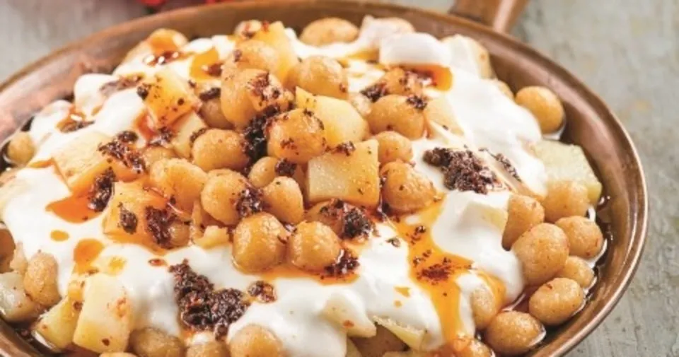 Bulguru 1 su bardağı sıcak suyla ıslatın. Üzerini kapatıp şişmesini bekleyin. Patatesleri bol suda haşlayın. 3 tanesini soyduktan sonra ezin. Kalan patatesleri de küçük küp şeklinde doğrayıp kenara alın. Şişen bulgura ezdiğiniz patatesleri, un, yumurta, tuz ve karabiber ekleyip yoğurun. Elinizi hafifçe ıslatıp hazırladığınız bulgurlu harçtan küçük parçalar koparıp avucunuzda yuvarlayın ve kızgın yağda kızartın. Fazla yağını almak için kağıt havlu üzerine alın. Sonra servis tabağına aktarıp üzerine sarmısaklı yoğurt ve küp doğradığınız patatesleri ekleyin. Pul biberi tereyağında yaktıktan sonra üzerine gezdirip servis yapın.