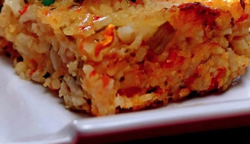 1PİRİNCİ tuzlu suda haşlayın. Süzüp soğuması için geniş bir kaba alın. Diğer taraftan sıvıyağı bir tavaya alıp ince kıyılmış sivri biberi kavurun. Üzerine küp doğranmış domates ekleyin. Birkaç dakika daha kavurup ocaktan alın. Tereyağını küçük bir tavada eritip, unu rengi dönene kadar kavurun. Sütü ekleyin ve koyulaşınca ocaktan alın. 2Soğuyan pirince yumurta, rendelenmiş kaşar peyniri, domatesli karışım, unlu karşım, dereotu, maydanoz, kabartma tozu, tuz, karabiber ve pulbiber ekleyip harmanlayın. 3Hazırladığınız harcı yağlanmış bir fırın kabına, fazla kalın olmayacak şekilde yayın. Önceden ısıtılmış 180 derece fırında üzeri kızarana kadar pişirin ve dilimleyerek servis yapın.