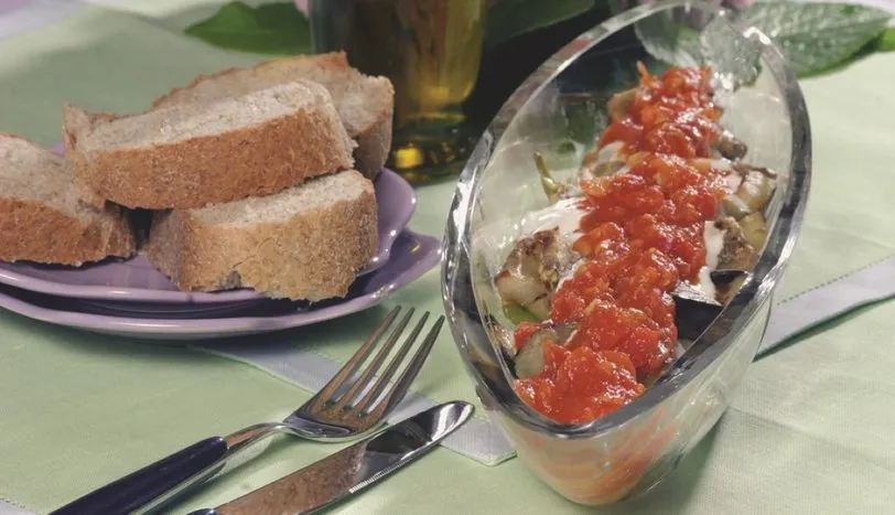Patlıcanın kabuklarını soyun. Acısının çıkması için tuzlu suda yarım saat bekletin. Suyunu süzün. Patlıcan ve biberleri yarım parmak kalınlığında doğrayın. Yapışmaz yüzeyli bir tencereye aldığınız 2 çorba kaşığı mısır özü yağında patlıcanları yağını çekene kadar çevirin. Biberleri ilave edip, kısık ateşte tencerenin ağzı kapalı olarak arada sırada çevirerek kızartın. Sos için, bir tavaya mısır özü yağını alın. içine kabukları soyulmuş ve küp şeklinde doğranmış domatesleri ilave edin. ince kıyılmış sarımsak ve kahverengi kesme şekeri atıp kısık ateşte pişirin. Ayrı bir kapta yoğurt ve dövülmüş sarımsakları karıştırın. Servis tabağına aldığınız patlıcan ve biberlerin üzerine, sarımsaklı yoğurdu dökün. En üste domates sosu gezdirip servis yapın.