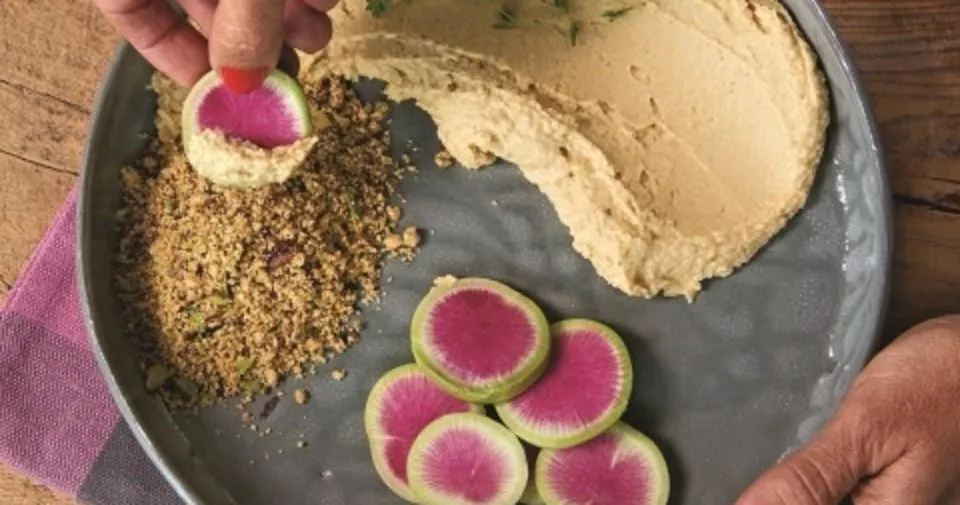 Dükkah için tüm malzemeyi mutfak robotundan geçirip toz haline getirin. Kapaklı bir kaba doldurun. Humus için nohut, tahin, kimyon, sarımsak, limon suyu, zeytinyağı ve suyu kıvam alana kadar mutfak robotundan geçirin. Gerekirse 2-3 yemek kaşığı su ilave edip karıştırın. Geniş bir tabağın bir köşesine dukkah, diğer köşesine humusu yerleştirerek servis yapın.