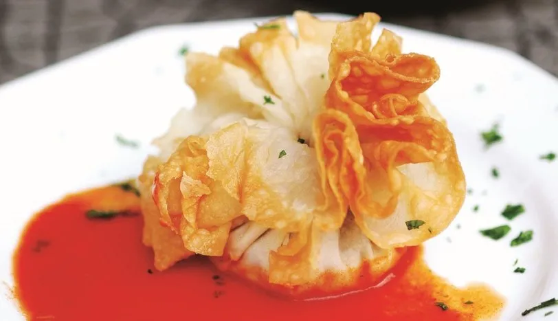 İç harcı için sıvı yağı bir tavaya alın. Fıstıkları ekleyip kavurun. Yemeklik doğradığınız arpacık soğanları ve kıymayı ilave edip, kavurmaya devam edin. Kuş üzümünü ve diğer baharatları ekleyip pişirin. İnce kıyılmış maydanozu da katıp, soğuması için kenara alın. Sos için soğanı yemeklik doğrayın. Bir tavada margarini eritip soğan ve sarımsakları kavurun. Küp doğranmış domatesleri ve tuzu ekleyip soteleyin. Koyulaşınca, sosu ocaktan alın. Yufkaları üst üste düz bir zemine yayın. Pasta tabağı büyüklüğünde 2 adet daire çıkarın. İç harcı yufkaların ortasına yayın. Yufkayı bohça şeklinde büzüp, pırasa yaprağı ile bağlayın. Önceden ısıtılmış 250 derece fırında üzerlieri pembeleşene kadar pişirin. Sosu servis tabağına yayın. Bohçaları sosun üzerine yerleştirip, sıcak servis yapın.