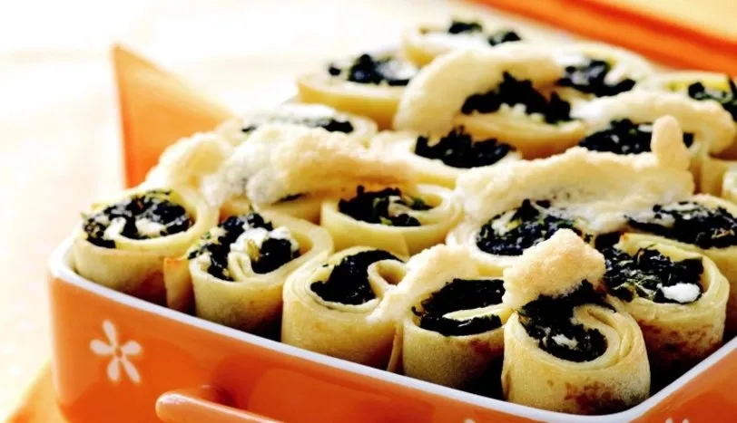 Ispanağı yıkayın ve blenderden geçirin. Yumurtalar, un, süt, tuz ve karabiberi ekleyin. Bu karışıma ıspanağı da ilave edin. Yapışmaz yüzeyli bir tavaya çok az yağ koyun ve ısıtın. Çember şeklinde bir kalıbı tavaya yerleştirin. Kalıbın ortasına 1 kaşık krep hamurundan dökün. Hamurun bir tarafı pişince diğer yüzünü çevirip pişirin. Kalan hamuru da bu şekilde hazırlayın. Her bir krebin üzerine 1 çay kaşığı kadar sıcak domates sosu, bunun üzerine de önceden tereyağında kavrulmuş karidesten koyun. Pırasa yaprağı ile bağlayın. Diğer krepleri de bu şekilde hazırlayın.