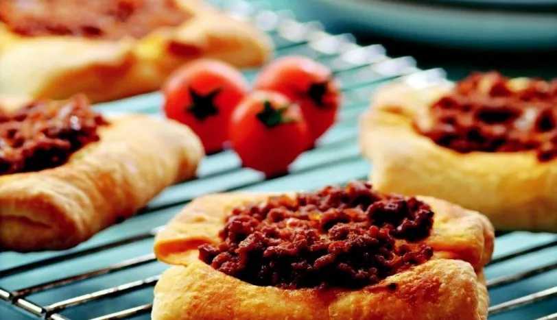 ÖNCELİKLE içi için kıyma ve kıyılmış soğanı bir tavada hafifçe kavurun. Salça, tuz ve karabiber ilave edip, 1-2 dakika daha kavurun. Soğuması için bir kenara alın. Hamur için derin bir kaba süt, su, sıvıyağ, maya, yoğurt, tozşeker ve tuzu alın. Kulak memesi yumuşaklığında bir hamur elde edene kadar un ilave edip, yoğurun. Üzerini nemli bir bezle örtün ve 45 dakika dinlendirin. Dinlenen hamurdan 15 adet beze yapın ve her bezeyi pasta tabağı büyüklüğünde açın. Bezelerin her birini bir fırça yardımıyla ayrı ayrı yağlayın. Önce karşılıklı kenarları ortada birleşecek şekilde, daha sonra diğer karşılıklı kenarları birbirinin üzerine gelecek biçimde kapatın ve kare bir hamur elde edin. Bütün hamurları aynı şekilde hazırlayın ve orta kısımlarına kıymalı iç harcı paylaştırın. Pideleri fırın tepsisine yerleştirin ve önceden ısıtılmış 175 derece fırında üzeri kızarana kadar pişirin. Sıcak olarak servis yapın.