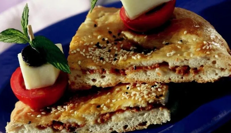 Hamuru hazırlamak için, mayayı 1 su bardağı ılık suda eritin. Geniş bir kaba unu alın ve zeytinyağı ile tuz ilave edin. Azar azar su ekleyerek kulak memesinden daha yumuşak bir hamur elde edin. Hamuru kaptan alıp üzeri örtülü olarak oda sıcaklığında 30 dakika dinlendirin. İçi için, kabukları soyulmuş domates, soğan ve biberi ince kıyın. Kıymayı bir kaba alıp üzerine kıyılmış sebzeleri ilave edin. Ceviz, kaşar peyniri rendesi, tuz ve karabiber ekleyip karıştırın. Dinlenen hamuru ikiye ayırın. Elinizle açarak tepsiye yerleştirin. Üzerine kıymalı harcı yayın. Diğer hamuru da elinizle açıp üzerine kapatın. Zeytinyağı ve yumurta sarısını çırpıp, pidenin üzerine sürün. Susam ve çörek otu serpin. Önceden ısıtılmış 200 derece fırında 35 dakika pişirip servis yapın.