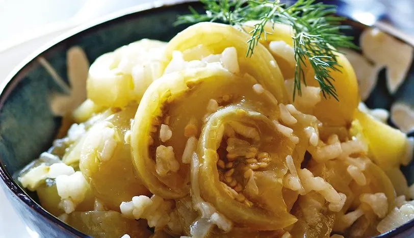 Domates turşusunu ikiye bölüp sudan geçirin. Geniş bir kaba alıp üzerine su ilave edin. Birkaç kez suyunu değiştirerek 1 saat kadar suda bekletin. Süzüp dilimleyin. Sıvı yağı bir tencereye alın. Üzerine turşuyu ekleyin. Arada bir karıştırarak kısık ateşte 5 dakika kavurun. Pirinç ve domateslerin üzerini geçecek kadar sıcak su ilave edin. Pirinç yumuşayana dek pişirip, servis yapın.