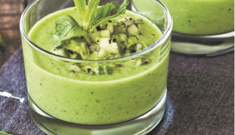 Bir adet küçük küp doğranmış salatalık, 1 diş sarımsak, 1 dal kıyılmış taze soğan ve küp doğranmış yarım soğanı harmanlayıp kaseye alın. Kalan salatalık, sarımsak, taze soğan, roka ve naneyi irice doğrayın ve bir kaba alın. Üzerine zeytinyağı ilave edin ve 20 dakika dinlendirin. Tuz ve karabiber ekleyip blenderden geçirerek püre haline getirin. Süzgeçten geçirip, baharatlarını kontrol edin. Limon suyu ekleyip karıştırın. Servis tabaklarına pay edip, üzerlerine kenara ayırdığınız sebzeli karışımdan yerleştirip servis yapın.