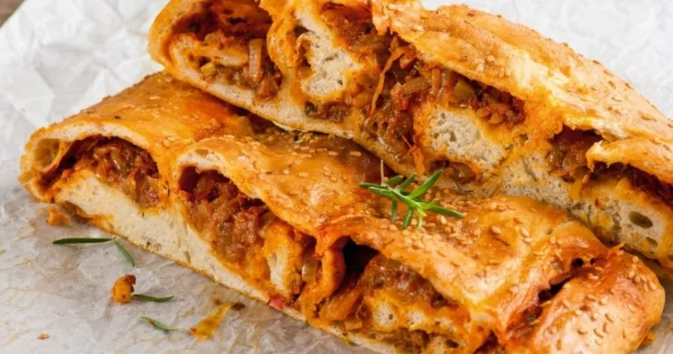Hamur için unu eleyip derin bir kaba alın. Maya, tuz ve ılık suyu karıştırın. Üzerini kapatıp 5 dakika bekletin. Mayalı karışımı unla karıştırıp yoğurun. Üzerine zeytinyağı sürüp, nemli bir bezle kapatın. Kabarması için sıcak bir ortamda dinlenmeye bırakın. Harç için soğanı yağ ile birlikte yayvan bir tencereye alın. Pembeleşinceye kadar kavurun. İçine salçaları ve baharatları ekleyip karıştırın. Domates sosunu ilave edin. Kaynamaya başlayınca suyu ve tuzunu katın. Kısık ısıda 15- 20 dakika suyunu çekene kadar pişirin. Hamuru unlanmış tezgaha alın. Büyük bir daire olacak şekilde açın. Hamurun karşılıklı iki tarafına sıra şeklinde malzemeyi yerleştirin. Daha sonra ortaya doğru yuvarlayıp, iki ruloyu ortada buluşturun. Uç kısımları yan yana gelecek şekilde ortadan kıvırın. Üzerine yumurta sarısı sürüp susam serpin. Önceden ısıtılmış 200 derece fırında 20 dakika pişirin. Dilimleyip servis yapın.