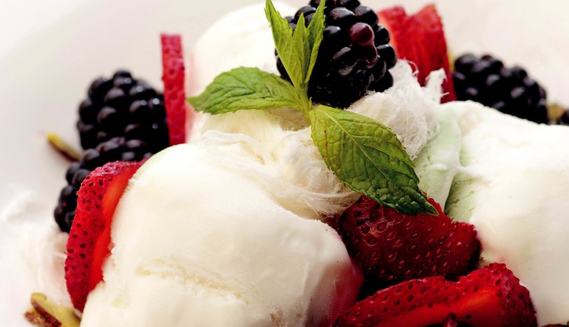 Ocaktan alıp, karıştırarak soğutun. Dilediğiniz şekilde bir kaba koyup, donana dek derin dondurucuda dinlendirin. Toplamda 3 kez, 2 saatte bir çıkarıp karıştırın. Servis tabağına alıp, böğürtlen, pişmaniye, çilek ve file antep fıstığı ile servis yapın. - 2