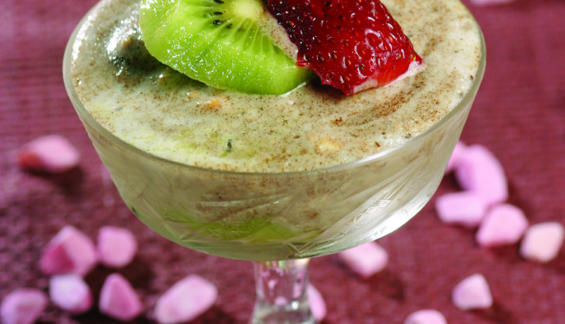 1 porsiyon için 1 adet kepekli kurabiye kullanarak, diğer malzemeyle de aynı işlemleri tekrarlayın. 8 adet kupu bu şekilde hazırlayarak buzdolabında 1 saat bekletin. Arzuya göre kivi ve çilek dilimleriyle süsledikten sonra, soğuk olarak servis yapın.