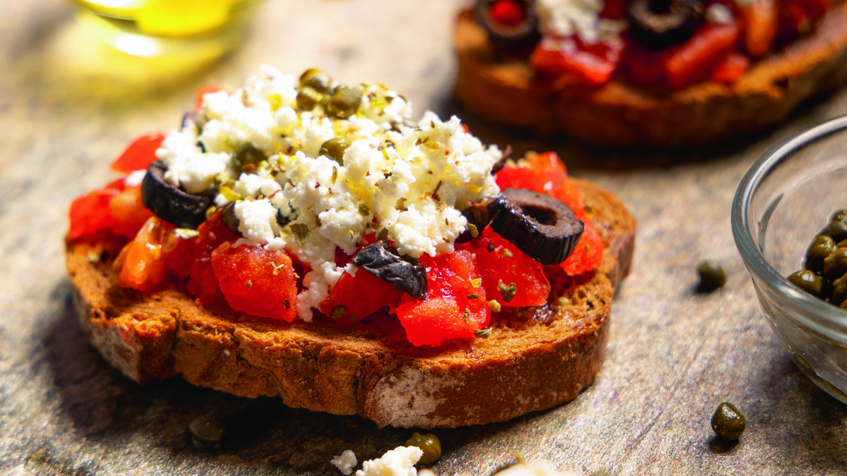 Girit mutfağının en sevilen lezzeti Dakos, çıtır arpa peksimeti üzerinde domates, peynir ve zeytinyağıyla hazırlanan ferah bir meze