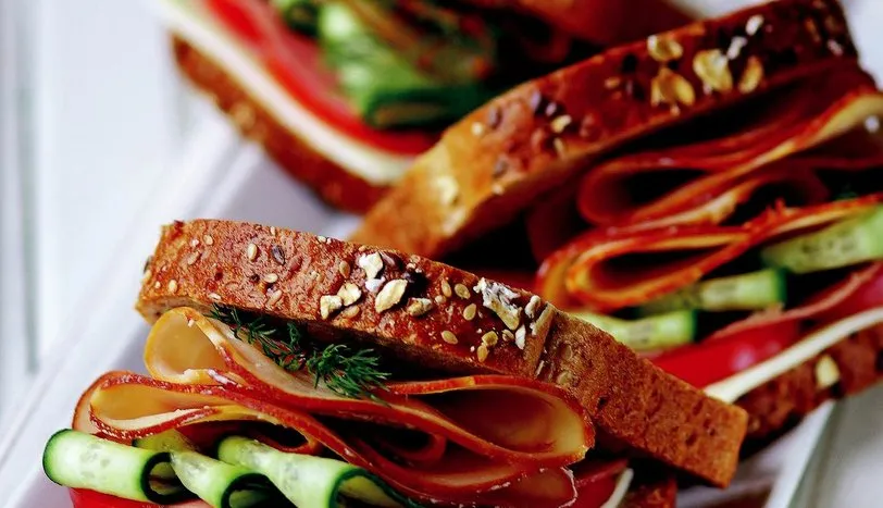 domates, jambon ve salatalık dilimlerini yerleştirin. En üste ikişer dilim tavuk füme koyun. Dereotu