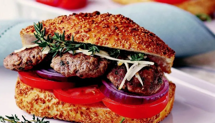 KÖFTELERİ hazırlamak için kıymayı geniş bir kaba alın. Üzerine küçük boy soğanı rendeleyin. Kıyılmış maydanoz, salça, ılık su, tuz ve karabiber ekleyip yoğurun. Hazırladığınız harçtan yuvarlak ve çok kalınolmayan köfteler hazırlayın. Az sıvıyağn koyduğunuz tavada önlü arkalı pişirin. Domates ve kırmızı soğanı halka doğrayın. Sandviç ekmeklerini tamamen ikiye ayırmadan, enlemesine ikiye kesin. Her ikiyüzüne de krem peynir sürün. Domates ve halka soğan dilimlerini yerleştirin. Üzerine köfteleri, rendelenmiş Çerkes peynirini ve kekiği koyup servis yapın.