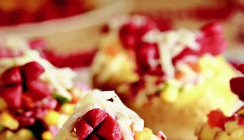 YIKANMIŞ patatesleri kabuklarıyla birlikte 15 dakika haşlayın. Suyunu süzdükten sonra üst kısmını bıçakla (+) şeklinde çizin ve tatlı kaşığıyla içini çıkarıp bir kaba alın. Bu kaba, mısır, küp doğranmış turşu, kıyılmış maydanoz, hardal, ketçap, tereyağı, kaşar peyniri, tuz, karabiber ve pulbiber ekleyip karıştırın. İçleri boşaltılmış patateslere bu karışımı paylaştırın. Diğer taraftan sosisleri iki ucundan (+) şeklinde kesin ve kızdırılmış sıvıyağda kızartın. Kumpirlerin üzerine 1'er adet sosis yerleştirin. En üste de kaşar peyniri serpin ve servis yapın.