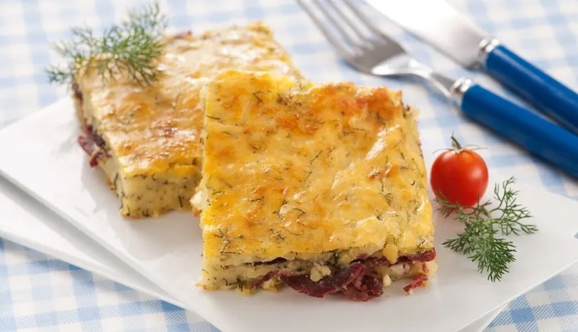 Yağı eritin ve ılıtın. Haşlanmış patatesi rendeleyin. İçine 2 adet yumurta ve 1 adet yumurtanın akı, beyaz peynir, dereotu, tuz, kabartma tozu ekleyip karıştırın. Orta büyüklükte ısıya dayanıklı bir fırın kabını yağlayın. Peynirli karışıma ılımış yağı ilave edip karıştırın. Un ilave edin ve tekrar karıştırın. Hamurun yarısını yağlanmış fırın kabına boşaltın ve elinizle bastırın. Üzerine pastırmaları dizin. Kalan hamuru üzerine yayıp, elinizle bastırın. Üzerine yumurta sarısı sürün. Önceden ısıtılmış 200 derece fırında üzeri kızarana kadar pişirin.