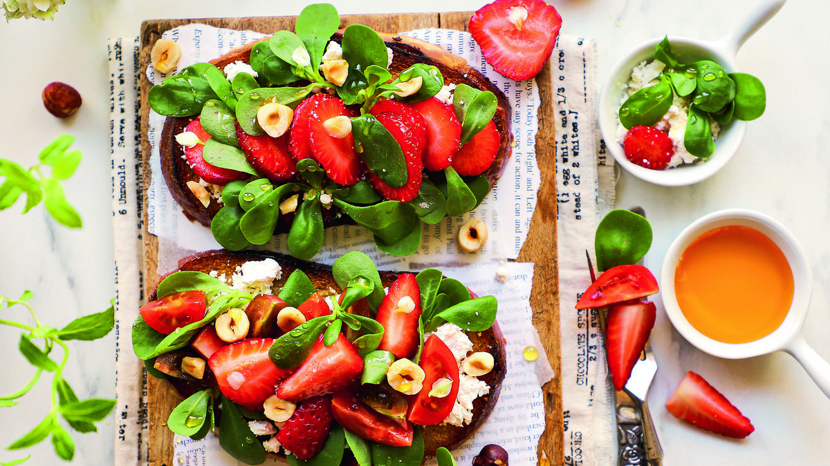 Bir dilim ekmeğin üzerine çilek, diğer dilime domates, kalan dilime de hem çilek hem domates dilimlerini yerleştirin. Kavrulmuş fındık serpin. Bal gezdirip servis edin.