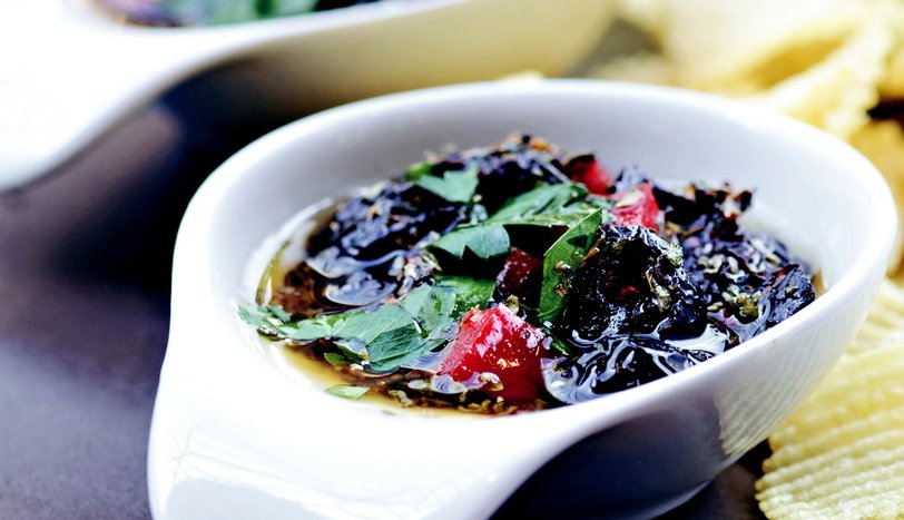 Zeytin, sarmısak, maydanoz, kişniş, zeytinyağı, sirke ve pul biberi iyice karıştırın. Karışımı ekme dilimlerinin üzerine sürüp servis yapın.