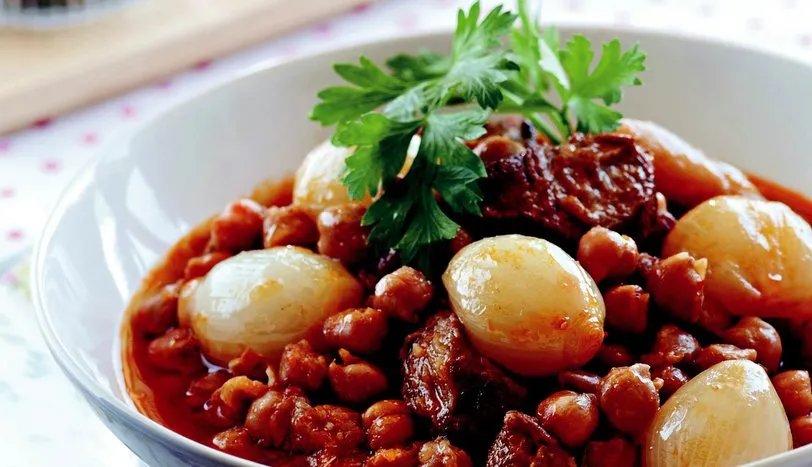 Nohudu akşamdan ıslatın. Ertesi gün haşlayıp süzün. Soğanları temizleyin. Eti tencereye alıp suyunu salıp çekene dek pişirin. Üzerine tereyağı, soğan ve sarımsağı ekleyin. 5 dakika karıştırarak pişirin ve salçaları katın. Nohut, sirke, tuz ve baharatları katın. Üzerini geçecek kadar sıcak su ilave edin. Azaldıkça su ilave ederek, et yumuşayana dek pişirin ve ocaktan alın.