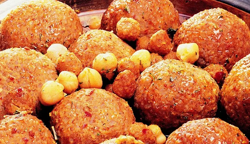 Bulguru, 1 su bardağı kaynar su ile ıslatıp suyunu çekene kadar bekletin. Üzerine tuz, karabiber, kimyon ve biber salçası ekleyip yoğurun. Yumurta ve unu ekleyip yeniden yoğurarak kenara alın. İçini hazırlamak için kıymayı bir tavaya alıp suyunu çekene kadar pişirin.Üzerine ince kıyılmış soğanı ilave edin. 2-3 dakika pişirdikten sonra biber salçası, tereyağı, pulbiber, tuz ve karabiberi ekleyip kavurun. Soğumaya bırakın. Önceden hazırladığınız hamurdan bir parçayı kenara alın. Kalan hamurdan ceviz büyüklüğünde parçalar kopartıp elinizi ıslatarak yuvarlayın ve ortalarını açın. İçlerine hazırladığınız harçtan doldurup yenidenkapatın ve yuvarlayın. Kenara ayırdığınız hamurdan da fındık büyüklüğünde yuvarlak köfteler yapın. Et suyunutencereye alıp, domates, limon suyu, tuz ve karabiber ekleyerek kaynatın. İçine nohutları ve küçük köfteleri ilave edin. Ayrı bir tavada tereyağını eritip nane ve salçayı yakın. Bu sosu tencereye ekleyin. Büyük köfteleri de katıp, köfteler yumuşayana kadar pişirin. Maydanozla süsleyip, servis yapın.AŞÇININ NOTUDövülmüş et, sinirsiz etin satırla kıyılması ile elde edilen kıymadır.