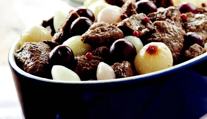 Arpacık soğanları tencereye alıp sıvı yağda pembeleştirin. Kevgir yardımıyla soğanları başka bir kaba aktarın. Eti tenceredeki sıvı yağa ekleyip, harlı ateşte kavurun. Tane kırmızıbiber, tuz ve soğanları ilave edin. Hafifçe karıştırıp, 1 çay bardağı sıcak su ekleyin. Tencerenin kapağını kapatıp, kısık ateşte 30 dakika pişirin. Ocaktan almaya yakın vişne ekleyip harmanlayın ve servis tabağına aktarın.