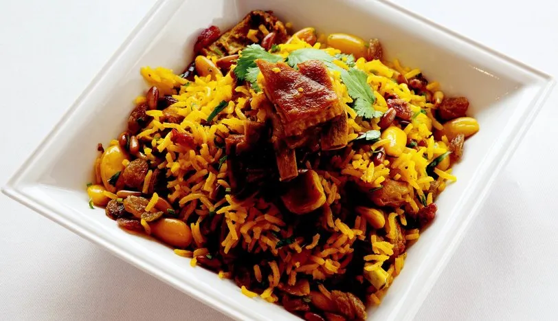 Tereyağı ve sıvı yağı tencereye alıp kızdırın. Kıyılmış soğan ekleyip kavurun. Et ilave edip, iyice soteleyin. Et suyu ekleyip, et yumuşayana dek pişirin. Pirinç, safran, karabiber ilave edin. Kuru üzüm ekleyip, tuzunu ayarlayın. Pilav suyunu çekene dek kısık ateşte pişirin. Yapışmaz yüzeyli tavada ayrı ayrı badem ve fıstığı kavurun. Pilava ekleyip harmanlayın. 10-15 dakika dinlendirin. Dilediğiniz şekilde süsleyip, ılık olarak servis yapın.