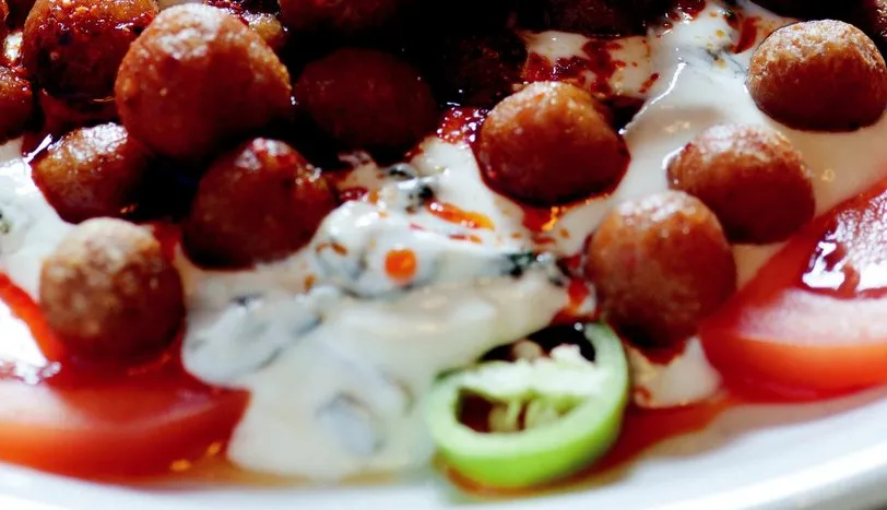Öncelikle ince bulgur, kıyma, rendelenmiş soğan, tuz, karabiber ve kırmızıbiberi iyice yoğurup, misketköfteler yapın. Köfteleri önce buharda haşlayıp, daha sonra çok az kırmızıbiberle zeytinyağında hafifçekızartın. Pazıyı ince kıyıp haşlayın ve suyunu sıkıp top yapın. Süzme yoğurda ince kıyılmış sarmısağı katıp,pazıyla karıştırın. Pazıyı servis tabağına yayın. Üzerine köfteleri koyup servis yapın.