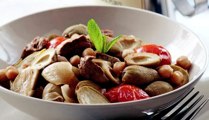 Eti tencereye alıp, suyunu salıp çekene dek pişirin. Piyazlık doğranmış soğan ve tereyağını ekleyip soteleyin. İkiye bölünüp çekirdek yatakları çıkarılmış çağla ve nohut ilave edin. Üzerini geçecek kadar
