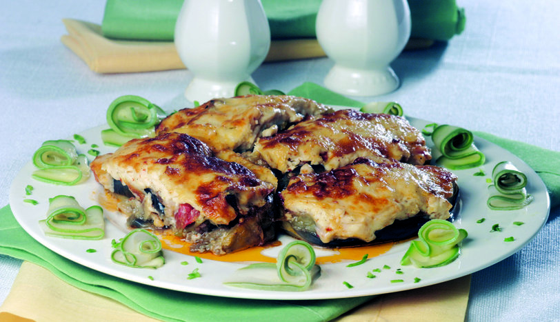 PATLICANLARI soyup ortadan ikiye bölün. İçlerini bıçakla oyarak çanak şeklini verin ve her patlıcandan iki adet çanak elde edin. Patlıcanları, acılığının gitmesi ve kararmasını önlemek için tuzlu suyla doldurduğunuz derin bir kaba alın. Bir tencerede 1 çorba kaşığı margarini eritip, etleri kuvvetli ateşte kavurun. Biberleri incecik doğrayın. Domatesleri de küçük küpler halinde doğrayın. Etler iyice kavrulduktan sonra, içine sivri biberleri, doğranmış domateslerin yarısını ve tuzu ekleyin. Eti özelliğine göre ya domatesler yumuşadıktan sonra ocaktan alabilir, ya da 1-2 çay bardağı sıcak su ilave ederek suyunu tamamen çekene kadar pişirebilirsiniz. Patlıcanları, şekillerini bozmayacak şekilde sıkarak sudan çıkarın. Kağıt havluyla kurulayın. Kızgın yağda 1-2 dakika, rengi dönene kadar kızartın. Delikli bir kepçeyle yağdan alıp, kağıt havlu üzerinde süzdürün ve bir fırın kabına yerleştirin. İçlerine, kavurduğunuz etli harcı doldurun. 1 su bardağı sıcak su ve kalan domatesleri üzerine ilave edin. Önceden ısıtılmış 180 derecelik fırına koyun. Bu arada patlıcanları fırına verdikten sonra, beşamel sosu hazırlayın. 3 çorba kaşığı tereyağı veya margarini eritip, unu üzerine ilave edin ve unun rengi hafifçe dönene kadar kavurun. Sütü azar azar kavurduğunuz una ekleyin. Topaklanmaması için sürekli karıştırarak 1-2 dakika pişirin. Tuz ve karabiber ekleyip ocaktan indirin. Fırına koyduğunuz patlıcan çanaklarının üzerine 15 dakika sonra, hazırladığınız beşamel sosu yayın. Kaşar peynirini sosun üzerine ekleyin. Çanakların en üstüne kırmızıbiber serpip yeniden fırına verin. 15 dakika daha pişirin. Kabağı boylamasına incecik kesin. Kaynar suya batırıp çıkartın ve tabağı, şekillendirdiğiniz kabaklarla süsleyip servis yapın.