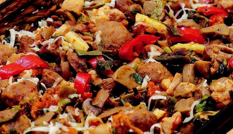 Köfte için un ve sıvı yağ dışındaki malzemeleri karıştırıp yoğurun. Erik büyüklüğünde top köfteler hazırlayın. Una bulayıp kızgın yağda kızartın. Tavuk etlerini kuşbaşı doğrayıp yağda kızartın. Üzerlerine tuz ve karabiber serpin. Soğanları yemeklik doğrayın. Eti zeytinyağında kavurun. Üzerine 2 çorba kaşığı yemeklik doğranmış soğan, sarımsak, tuz ve karabiberi ekleyin. 1 su bardağı sıcak su gezdirip suyunu çekene kadar pişirin. Diğer tarafta mantarları dilimleyip yağda kavurun. Üzerine kalan soğanı, kıyılmış maydanozu, doğranmış biber ve domatesi ilave edip domatesler yumuşayana kadar pişirin. Üzerine et, tavuk ve köfteleri ekleyip karıştırın. Isıya dayanıklı fırın kabına alıp üzerine yarım çay bardağı su gezdirin. Önceden ısıtılmış 200 derece fırında 10 dakika pişirin. Fırından çıkartıp üzerine rendelenmiş kaşar peyniri serpip, sıcak olarak servis yapın.