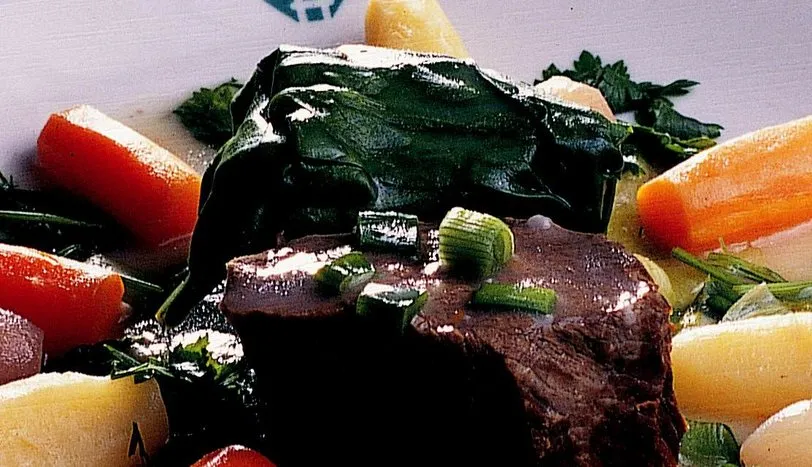 Tereyağını bir tencereye alıp erittikten sonra, dövülmüş sarmısakları ve arpacık soğanları pembeleşene kadar kavurun. Eti tencereye alıp suyunu salıp tekrar çekene kadar pişirin. Unu üzerine serpip topaklanmaması için sürekli karıştırın. Karıştırmaya devam ederek suyu ilave edin ve orta ateşte bir buçuk saat pişirin. Etler yumuşamaya başlayınca tuz, damla sakızı ve tozşekeri ekleyin. Daha sonra sırasıyla, irice doğradığınız havuç, kereviz, taze soğan ve patatesi tencereye ilave edin. Sebzeler yumuşayınca üzerine irice kıyılmış marul ve pazıyı ekleyin. 10 dakika pişirip ocağı kapatın. Yemeğin üzerine kıyılmış maydanoz ve dereotu serperek servis yapın.
