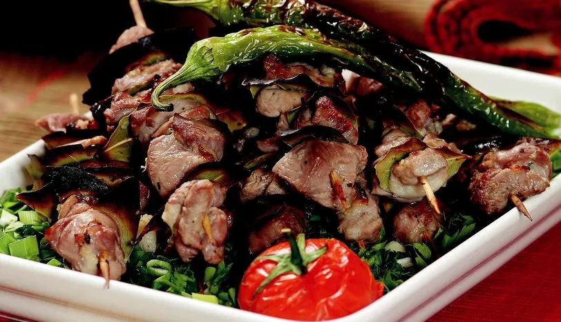 Soğanı rendenin ince tarafı ile rendeleyin. Üzerine ezilmiş sarmısakları, tuz ve karabiberi de ilave edip etlere ekleyin. Bu şekilde buzdolabında 2 saat dinlendirin. Büyük boy çöp şişlere bir parça et ve bir adet defne yaprağı olacak şekilde 6-7 adet dizin. Etleri ızgaraya koyarak arkalı önlü kızartın. Diğer taraftan taze soğan, dereotu ve maydanozu ince kıyıp karıştırdıktan sonra geniş bir servis tabağına alın. Pişen şişleri yeşilliklerin üzerine koyarak servis yapın.