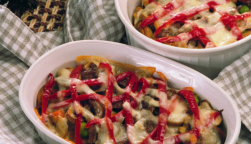 1 TAVAYA sıvıyağın yarısını alıp, jülyen doğranmış etleri suyunu bırakıp, çekene dek kavuralım. Etlerin üzerini hafifçe aşacak kadar sıcak su ekleyerek, etler yumuşayana dek pişirelim. Bu arada ayrı bir tavada kalan yağ ile küp doğranmış soğanı pembeleşene dek kavuralım. Dilimlenmiş mantarları ekleyerek suyunu bırakıp, çekene dek kavurmaya devam edelim. Pişen etleri mantarlara ekleyelim. 2 Haşlayıp, tavla zarı iriliğinde doğradığımız havuçları ve bezelyeleri, tuzu ve karabiberi ekleyerek birkaç kez karıştırıp tavayı ateşten alalım. Sebzeli harcı tek kişilik güveç kaplara paylaştırıp, üzerlerine rendelenmiş kaşar ve doğranmış kırmızı biber serpelim. Önceden ısıtılmış 200 derece fırında kaşarlar eriyene dek pişirelim.