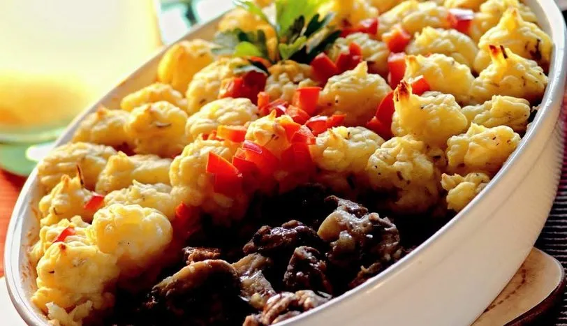 SIVIYAĞIN yarısını bir tencereye alıp etleri üzerine ekleyin. Etler suyunu salıp yeniden çekene kadar kavurun. Su, kekik ve tane biberleri ilave edip pişmeye bırakın. Yumuşayınca ocaktan alıp suyunu süzün. Diğer taraftan kalan sıvıyağı bir tavaya alıp ince doğranmış mantarları 2-3 dakika sote edin. Ocaktan alıp süzdüğünüz etlerle karıştırın. Tuz katın. Üzerine kıyılmış maydanoz ekleyin. Karışımı bir fırın kabına alın. Püreyi hazırlamak için, patatesleri haşlayıp kabuklarını soyun ve iyice ezin. Bir tencereye alıp ocağa oturtun ve üzerine tereyağını ekleyin. Sürekli karıştırarak sütü azar azar karışıma yedirin. Suyunu tamamen çekince ocaktan alıp biberiye, muskat ve tuz ilave edin. Ilındıktan sonra bir sıkma torbasına alın. Püreyi fırın kabındaki etlerin üzere sıkın. Üzerine ince kıyılmış kırmızı biber serpin. Önceden ısıtılmış 180 derece fırında üzeri kızarana kadar pişirip servis yapın.